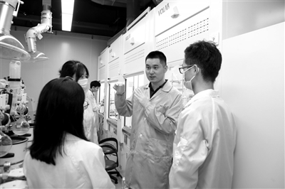 圖為深職大特聘教授滕超與團(tuán)隊(duì)成員在實(shí)驗(yàn)室探討材料配方方案。 學(xué)校供圖