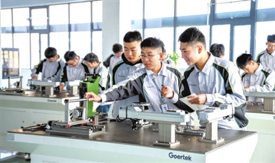 在歌爾匠造中心機械裝調理實一體化教室里,學生在學習典型機械結構裝配調試。資料圖片