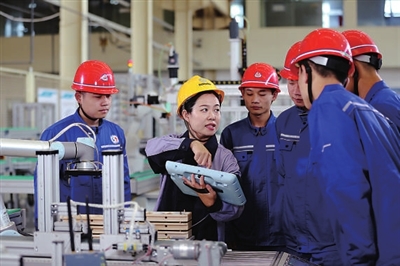 濟(jì)南職業(yè)學(xué)院教師指導(dǎo)學(xué)生開展墻壁開關(guān)智能柔性生產(chǎn)線調(diào)試實(shí)訓(xùn)。學(xué)校供圖